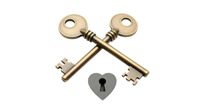 Two crossed golden keys with a heart shaped keyhole isolated on transparent background