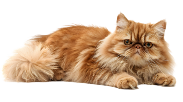 Playful long-haired persian cat with dramatic puff in a studio setting close-up view, isolated on white or transparent background