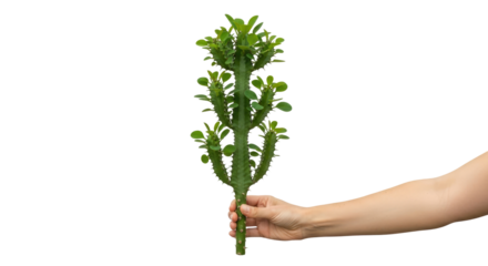 presenting natures resilience a hand offering a vibrant euphorbia plant, symbolizing lifes persistence, isolated on transparent background