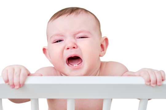 A sad baby is crying in a crib, holding onto the handrails, isolated on a white background. Funny child in bed, age six months