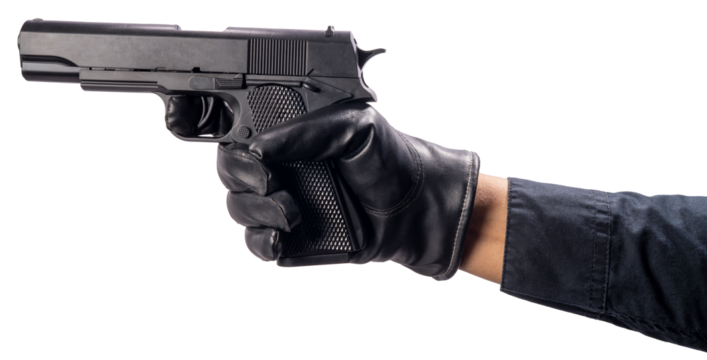 A hand holding a pistol against a white background, symbolizing danger and crime