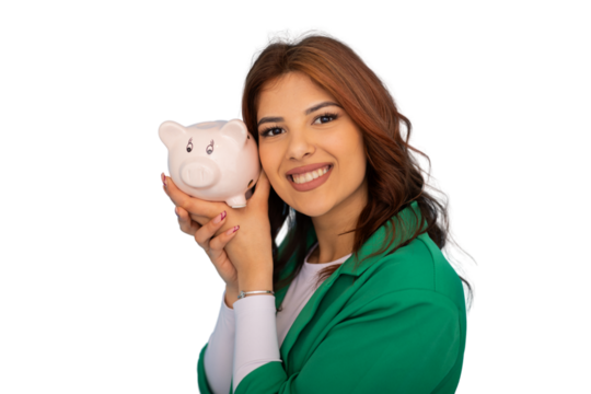 Professional businesswoman grasping piggy bank, symbolizing personal financial planning and savings strategy, white background