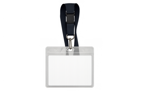 Blank id card holder with black lanyard, plastic badge mockup, empty pass for identification and security access
