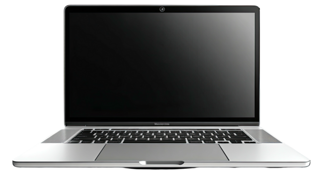 Open laptop displays a blank, dark screen on a simple surface