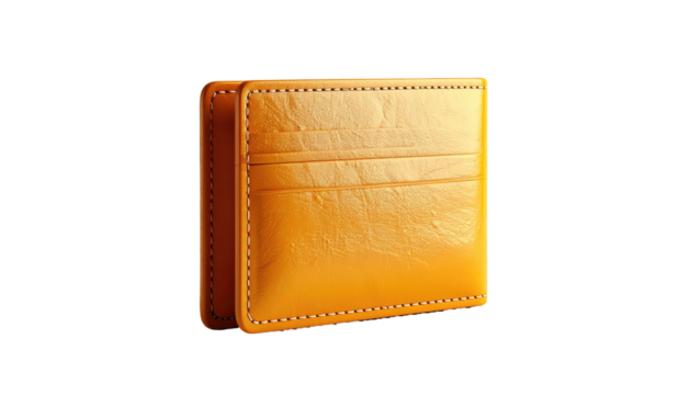 A close-up shot of an open, stitched leather wallet in vibrant orange color