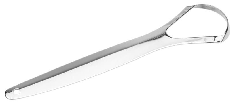 Stainless steel tongue scraper for oral hygiene, daily cleaning. Reusable dental care tool for fresh breath, bacteria removal and healthy mouth routine. Minimal medical accessory for personal care use