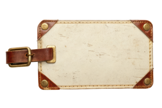 Vintage luggage tag for travel and adventure with leather strap and metal accents designed for personalization