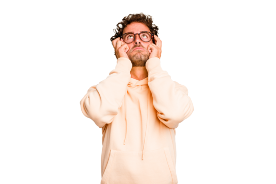 Young curly smart caucasian man cut out isolated whining and crying disconsolately.