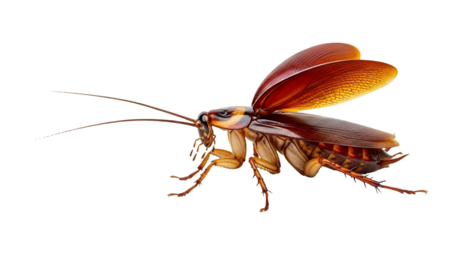 Brown cockroach with wings spread, crawling insect, isolated with transparent background