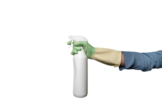 Hand holding spray bottle with gloves for insect extermination or windows cleaning.