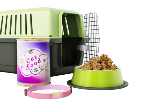 Cat collar, carrier and food on transparent background.