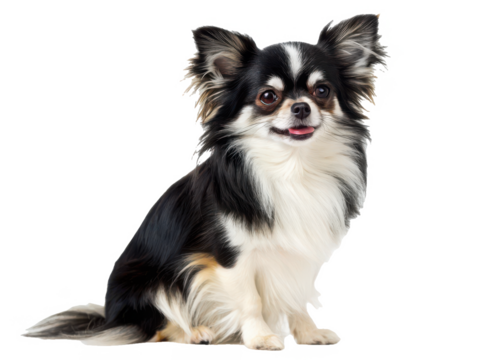 A charming, small, long-haired Chihuahua with a distinctive black and white coat pattern sits attentively in a slightly angled pose, displaying a playful, isolated on transparent background.