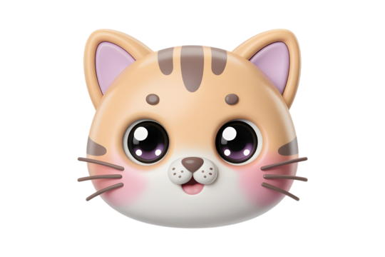 Cute 3D cat face with big purple eyes, adorable kitten character for pets and feline themes