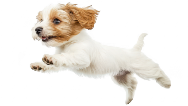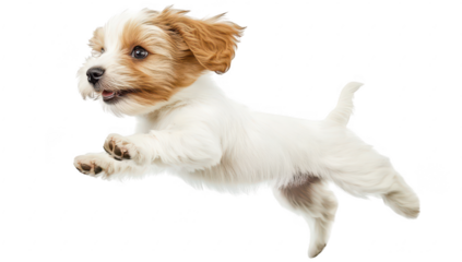 A playful puppy leaps joyfully in mid-air against a clean white background. its energetic spirit and playful nature. perfect for pet-related themes and joyful imagery