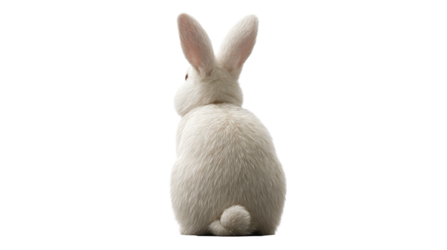 Fluffy white bunny seen from behind with long ears and a small tail, perfect for Easter and spring themed celebrations and products.