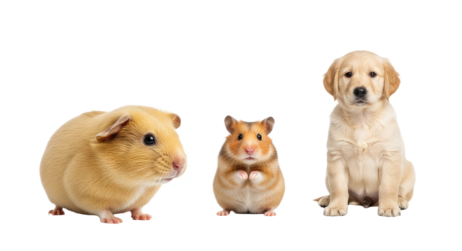 Cute hamster guinea pig and golden retriever puppy sitting together isolated on white background, perfect for pet care and animal friendship themes