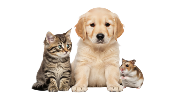 Golden retriever puppy, hamster and tabby kitten sitting together on wood stump isolated on white background, perfect for pet care and animal friendship themes