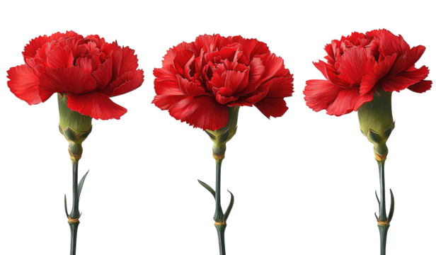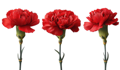 Three vibrant red carnations in profile, set against a black background.  The flowers are in sharp focus, showing detailed petal structure and stems