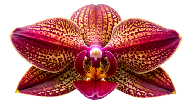 A vibrant close-up of a symmetrical orchid flower with spotted petals on a black background