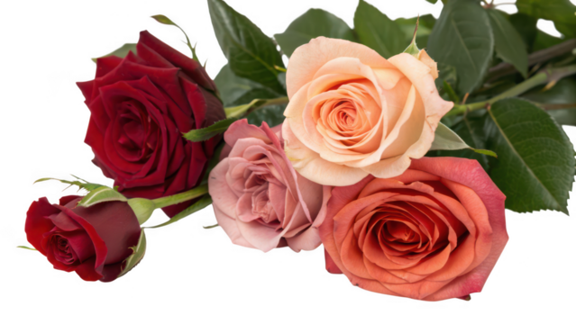 A beautiful bouquet of five multi colored roses with green leaves isolated on transparent background