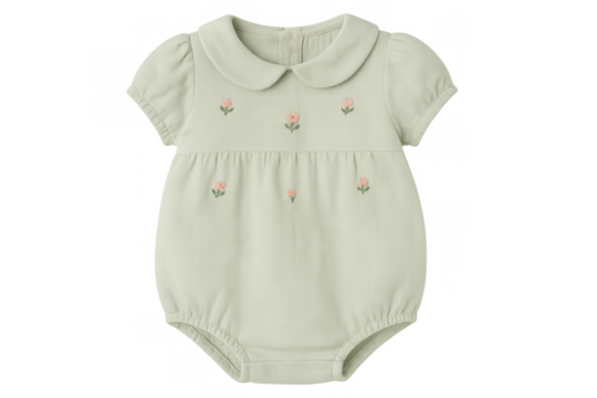 Sage green baby romper with peter pan collar and delicate embroidered flowers, comfy infant bodysuit for soft baby skin