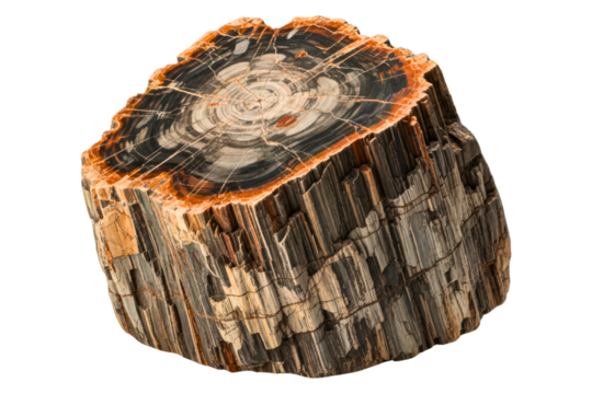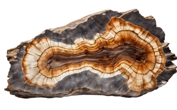 Petrified wood cross-section showing fossilized tree rings and ancient geological formation on transparent background