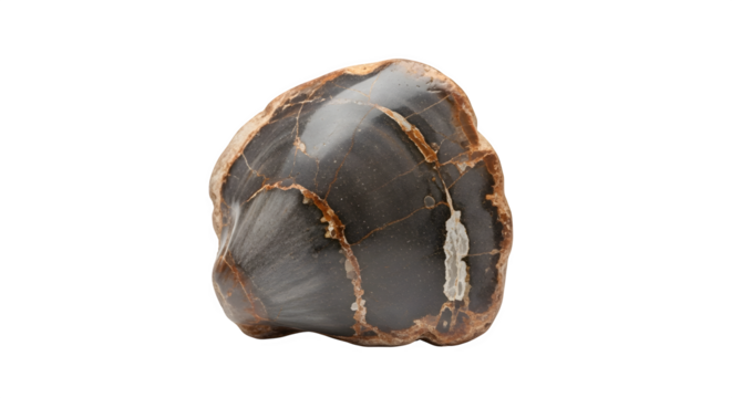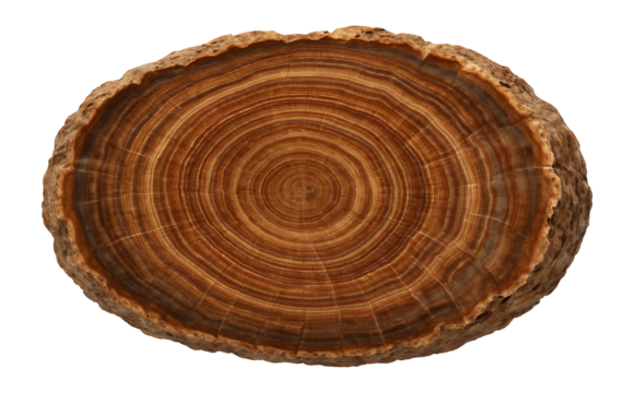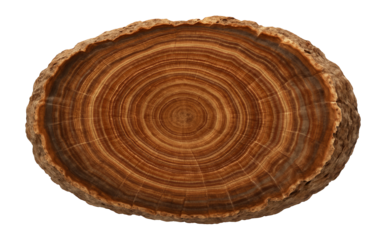 A polished petrified wood specimen showcasing its intricate grain patterns and earthy tones, isolated on transparent background for detailed examination