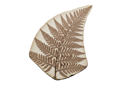 A remarkably preserved, pale brown petrified fossilized fern frond with intricate skeletal imprints and detailed veins, against a transparent studio background with copy space, concept of ancient