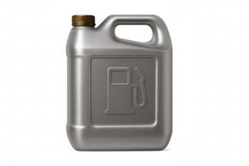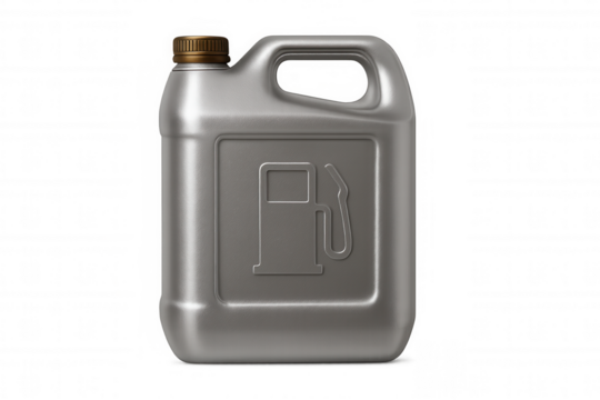 Silver plastic canister containing gasoline, featuring gas station symbol, isolated on transparent background