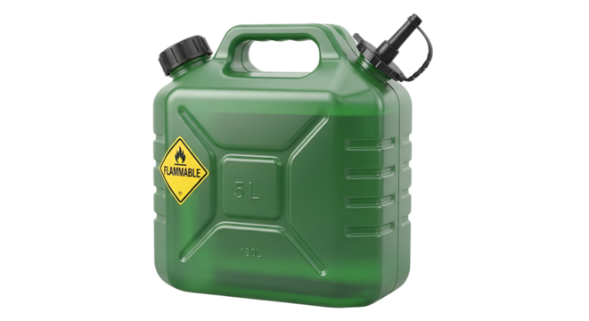 Green fuel can with the flammable warning label for carrying petrol isolated PNG with Transparent Background