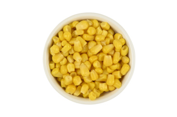 Maíz dulce en un bol de cristal sobre fondo blanco, visto desde arriba