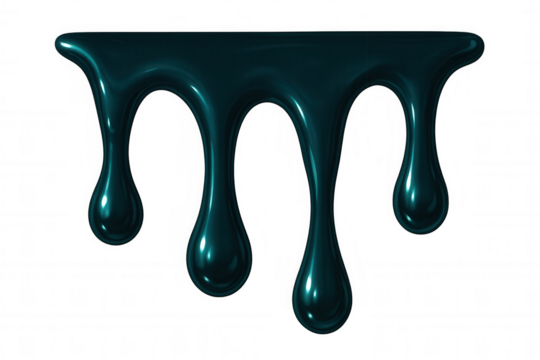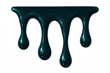 Thick, dark liquid dripping down against a transparent background, forming large, glossy drops that catch the light beautifully
