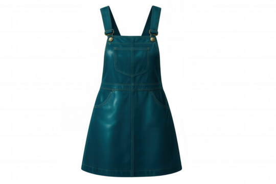 Studio shot of a teal pinafore dress with golden buttons, isolated on a transparent background