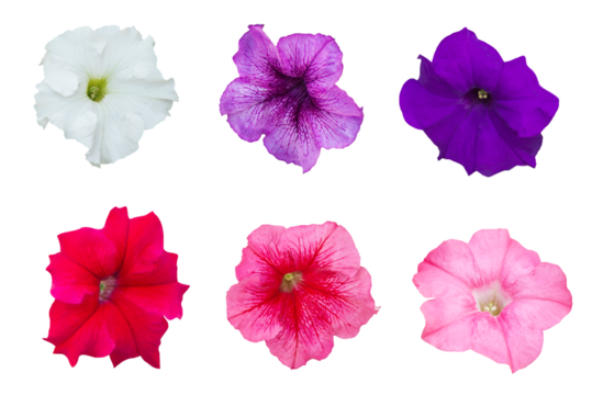 Close-up of several petunias in different colors in full bloom isolated on a png file on a transparent background.