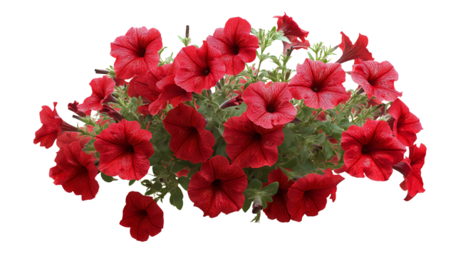 Vibrant red petunia flowers in full bloom isolated on transparent background. PNG