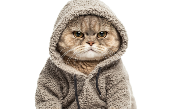 Playful cat in hoodie studio setting animal portrait cozy environment close-up view feline personality reflection