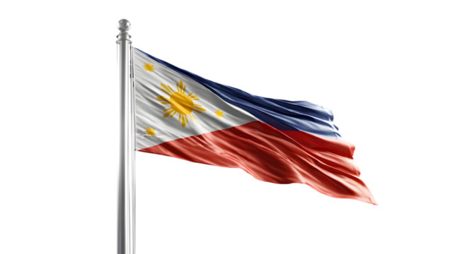 The waving Philippine flag, showcasing the sun, stars, blue, red, and white colors