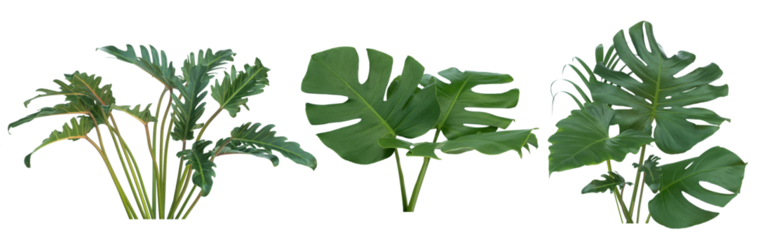 A set of philodendron leaves with deep green color, isolated on a transparent background, PNG file.