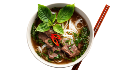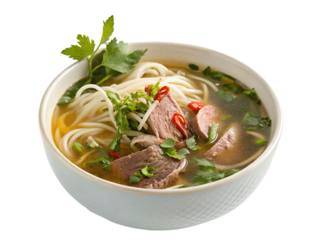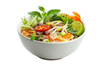 A bowl of beef pho with fresh herbs isolated on transparent background