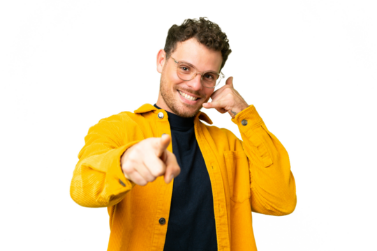 Brazilian man over isolated chroma key background making phone gesture and pointing front