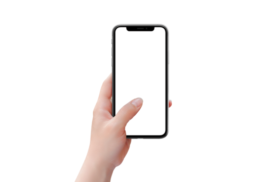 Hand holding modern smartphone with blank screen isolated on white. Great for mobile apps, technology, communication, display, UI, and digital concepts.