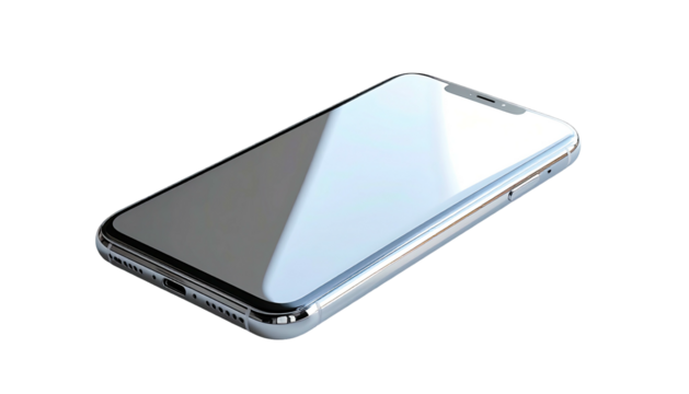 Smartphone laying on desk surface with PNG screen for mockup. Mobile phone template.