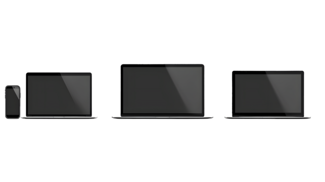 Set of smart devices smartphone, tablet and laptop with blank screen isolated on transparent background, PNG Format