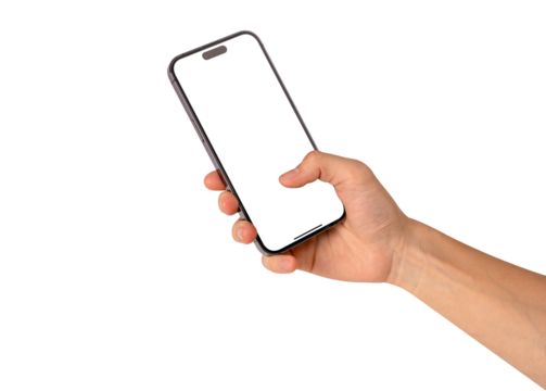 Close-up of hand holding modern smartphone with blank screen isolated.