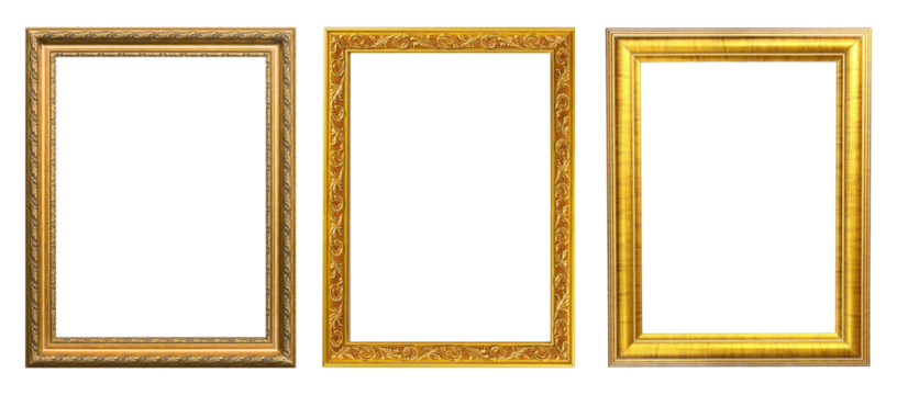 Golden wooden frame isolated on transparent background, Patterned and Vintage picture frame PNG format, old wide ornamental baroque picture frame