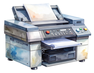 Artistic Watercolor Illustration of Classic Office Copier with Paper Feed, Transparent Background