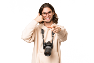 Young photographer man over isolated chroma key background pointing back with the index finger