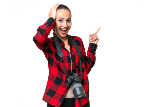 Young photographer Arab woman over isolated background surprised and pointing finger to the side