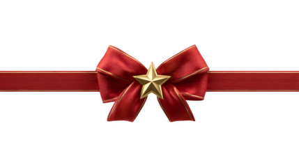 A photorealistic red ribbon, tied in a neat, symmetrical bow, with a single golden star attached to its center. Clean and classic, isolated on white background.