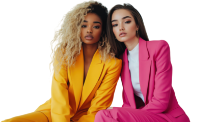 Two models showcase vibrant fashion styles in bright yellow and pink suits during a studio photoshoot